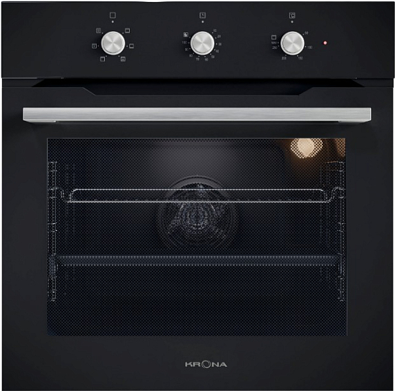 Духовой шкаф Krona ARADEO 60BL характеризуется стильным оформлением в черно-серебристой расцветке и расширенными возможностями приготовления, включая функцию предварительного нагрева.