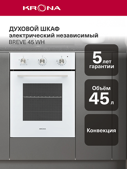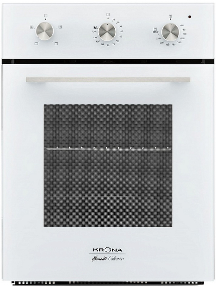 Духовой шкаф KRONA BREVE 45 WH выполнен в белом цвете с фасадом из стекла — такой материал характеризуется устойчивостью к температурному и химическому воздействиям, а также долгим сроком эксплуатации. Модель имеет компактные размеры, поэтому она подойдет даже для небольшой кухни.