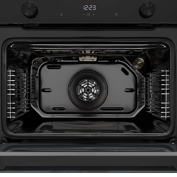 Особенности дизайна включают двухстекольную дверь с тангенциальным охлаждением, которая обеспечивает безопасность при использовании. Блокировка панели управления предотвращает случайное включение или изменение настроек. Дверь можно легко снять для удобства очистки, а эмаль легкой очистки Easy Clean помогает поддерживать идеальную чистоту внутри. В комплект входит глубокий противень и решетка для гриля, что позволяет готовить разнообразные блюда. Длина шнура 1440 мм обеспечивает гибкость при установке. Вес составляет 34.7 кг, что делает его достаточно легким для установки и перемещения.