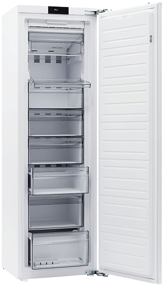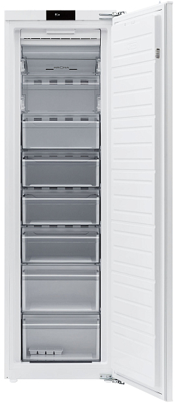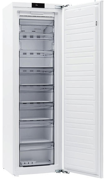 Встраиваемый морозильник Krona GRETEL FNF оснащен светодиодными лампами, все ящики устройства хорошо освещаются. Система охлаждения No frost циркулирует холодный воздух и не создает ледяной шубы на стенках. Функция быстрой заморозки нужна для новых продуктов и поддержания температуры уже замороженных.
