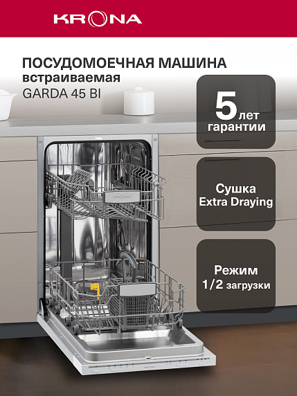 Посудомоечная машина Krona GARDA 45 BI — это встраиваемая модель, поэтому она прекрасно дополнит любой интерьер. Техника используется для мытья тарелок, чашек, стаканов, столовых приборов. Идеально подходит для встраивания в компактный кухонный гарнитур и обеспечивает превосходное качество мытья посуды для семьи из 4 человек. Вмещает в себя до 9 комплектов посуды.