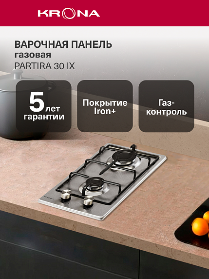Варочная панель KRONA PARTITA 30 IX представлена в цвете «Нержавеющая сталь». Она выполнена из нержавеющей стали — такой материал характеризуется устойчивостью к температурному воздействию, а также долгим сроком эксплуатации.
