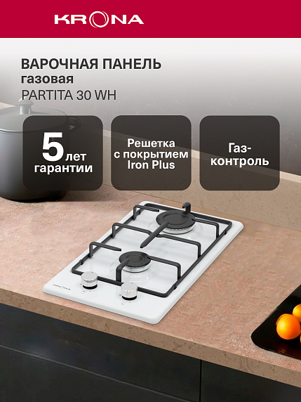 Варочная панель Krona PARTITA 30 WH выполнена из эмалированной стали в белом цвете. Такой материал достаточно прост в уходе и не требует особых усилий. Она имеет 2 газовые конфорки. Панель имеет современный внешний вид, поэтому будет лаконично и стильно смотреться на вашей кухни с абсолютно любым дизайном.