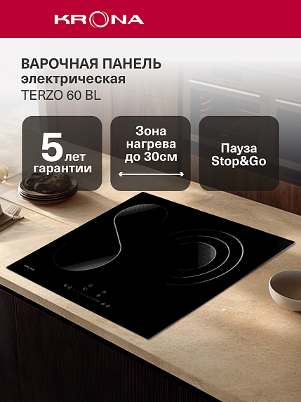 Независимая варочная панель Krona TERZO 60 BL представлена в универсальном черном цвете. Станет незаменимой помощницей на кухне. Данная модель оснащена тремя зонами нагрева различного диаметра, подойдет для нестандартной посуды. Относится к электрическому типу с электронным управлением и сенсорными переключателями, простыми и функциональными в использовании. Прибор выполнен из стеклокерамики повышенной прочности, после приготовления пищи достаточно протереть влажной тряпочкой. Для удаления сильных загрязнений нужно использовать специальный скребок, который входит в стандартную комплектацию. Гарантия от производителя составляет 60 месяцев.