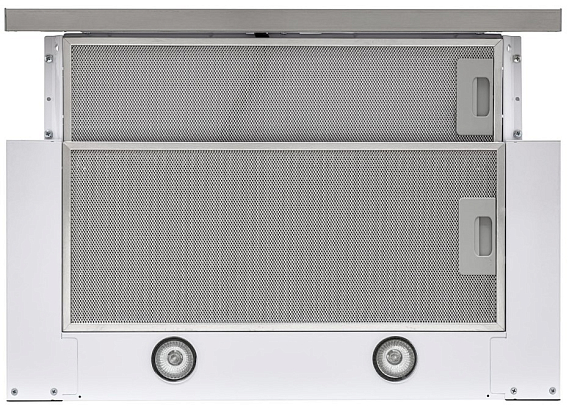 Телескопический экран, когда в нем нет нужды, располагается внутри корпуса вытяжки. Но когда требуется включить устройство — планка выдвигается. Также он обеспечивает захват загрязненного воздуха со всей площади варочной поверхности. Модели с таким дополнением обычно монтируются на нижнюю часть навесного шкафа.