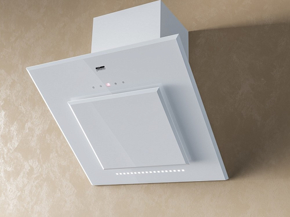 Наклонный тип вытяжки называется так из-за отклоняющегося от вертикального положения экрана, нависающего над варочной поверхностью. Данные приборы оснащаются электромотором, жироулавливающим и угольным (для режима рециркуляции) фильтрами, а также панелью управления, в зависимости от модели, сенсорной или кнопочной. Значительная часть моделей кроме трех стандартных скоростей вращения вентилятора имеют интенсивный режим, применяемый в экстренных ситуациях, например, когда, блюдо подгорело, и нужно срочно избавиться от дыма.