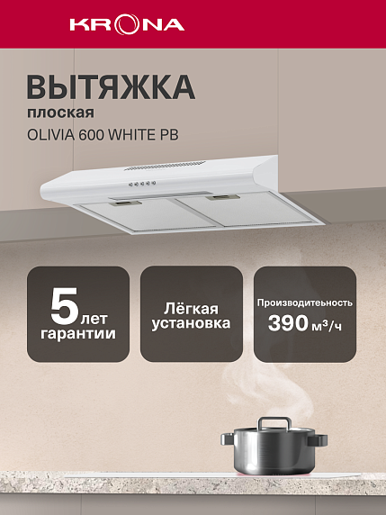 Вытяжка Krona OLIVIA 600 WHITE PB  — это козырьковая модель белого цвета шириной 60 см, которая создана для установки на стену над полноразмерной плитой или же варочной панелью. Её монтаж достаточно простой и лёгкий. Максимальная производительность вытяжки составляет всего 390 кубометров/час. Тремя скоростями и лампой накаливания управляют механические кнопки, расположенные на передней панели. Предусмотрено использование режимов: