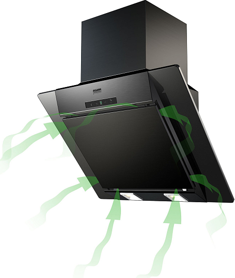 Наклонный тип вытяжки называется так из-за отклоняющегося от вертикального положения экрана, нависающего над варочной поверхностью. Данные приборы оснащаются электромотором, жироулавливающим и угольным (для режима рециркуляции) фильтрами, а также панелью управления, в зависимости от модели, сенсорной или кнопочной. Значительная часть моделей кроме трех стандартных скоростей вращения вентилятора имеют интенсивный режим, применяемый в экстренных ситуациях, например, когда, блюдо подгорело, и нужно срочно избавиться от дыма.