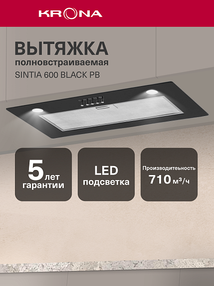 Вытяжка Krona SINTIA 600 BLACK PB — это встраиваемая модель, которая имеет высокую производительность и проста в эксплуатации. Она отличается компактными размерами и обширным набором функций. Техника имеет два режима работы: отвод и циркуляция воздуха. В режиме отвода всасываемый воздух выводится из помещения в систему вентиляции, а в режиме циркуляции — очищается с помощью фильтров от запахов и дыма и поступает назад в помещение.