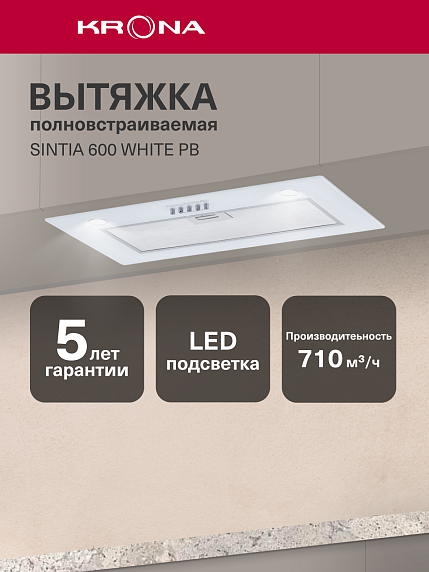 Вытяжка Krona SINTIA 600 WHITE PB порадует вас не только лаконичный дизайном, который идеально подойдет для любого кухонного интерьера, но и достойными характеристиками. Модель укомплектована антивозвратным клапаном, который автоматически перекрывает доступ к вентиляционной системе дома при отключении двигателя. Он предотвращает проникновение посторонних запахов в квартиру. Кроме того, устройство можно оснастить угольными фильтрами, поглощающими влагу и устраняющими неприятные запахи.