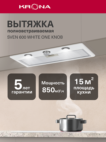 Вытяжка Krona Sven 600 White One Knob — идеальное решение для кухни, где важно сочетание функциональности и стильного дизайна. Белый цвет корпуса из металла придает ей строгий и современный вид, который легко впишется в любой интерьер. Благодаря настенному типу установки, данная модель экономит пространство, обеспечивая при этом эффективную работу.