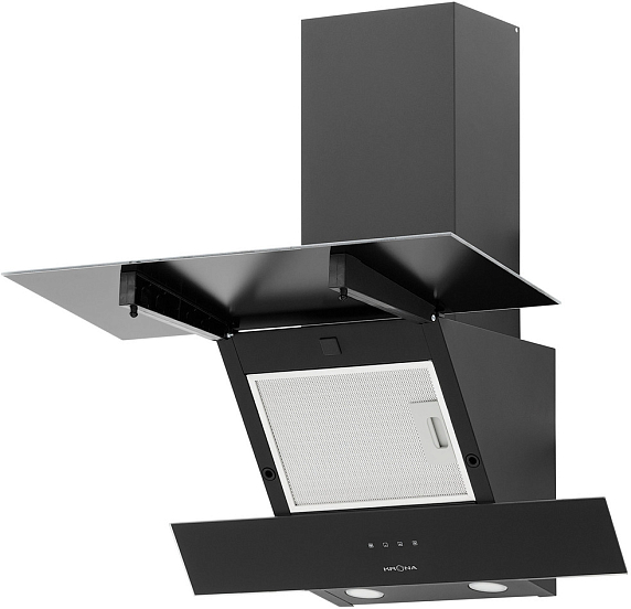 Наклонный тип вытяжки называется так из-за отклоняющегося от вертикального положения экрана, нависающего над варочной поверхностью. Данные приборы оснащаются электромотором, жироулавливающим и угольным (для режима рециркуляции) фильтрами, а также панелью управления, в зависимости от модели, сенсорной или кнопочной. Значительная часть моделей кроме трех стандартных скоростей вращения вентилятора имеют интенсивный режим, применяемый в экстренных ситуациях, например, когда, блюдо подгорело, и нужно срочно избавиться от дыма.